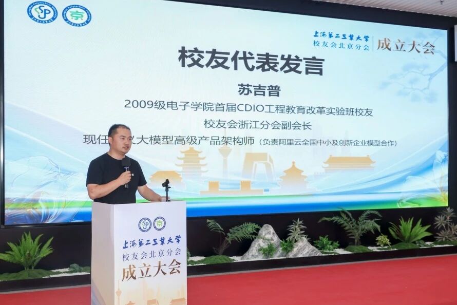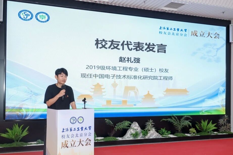 来自环境工程领域的专家致贺词,对北京分会的成立表示热烈祝贺,并表示,上海第二工业大学培养的应用型创新人才,以扎实的专业基础、突出的实践能力、务实的工匠精神,活跃在先进制造业、信息技术、现代服务业等国民经济的主战场,成为推动产业转型升级、实现技术落地应用不可或缺的重要力量。期待北京分会依托首都区位优势,搭建高水平交流平台,为校友发展与多元合作注入新动能。