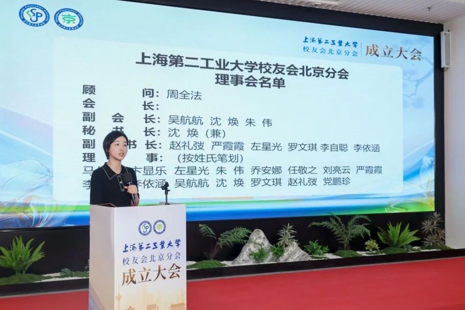 徐孝蕾代表学校校友总会宣读了上海第二工业大学校友会北京分会第一届理事会名单:周全法担任顾问,吴航航、沈焕、朱伟任副会长,沈焕兼任秘书长,赵礼弢、严霞霞、左星光、罗文琪、李自聪、李依涵任副秘书长。