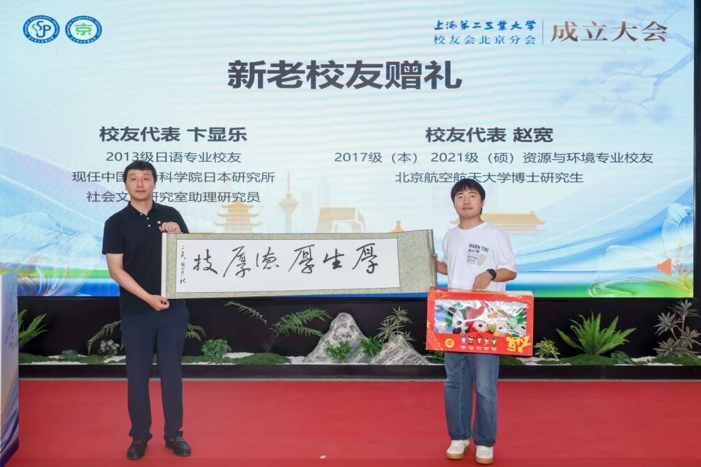 新老校友赠礼仪式上,2017届日语专业校友卞显乐、2024届资源与环境专业研究生校友赵宽代表北京分会新老校友互赠礼物。
