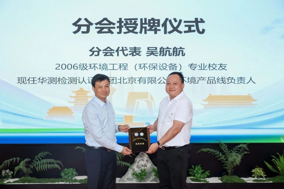 会上,谢华清为北京分会授牌,2010届环境工程(环保设备)专业校友、北京分会副会长吴航航代表分会接牌。